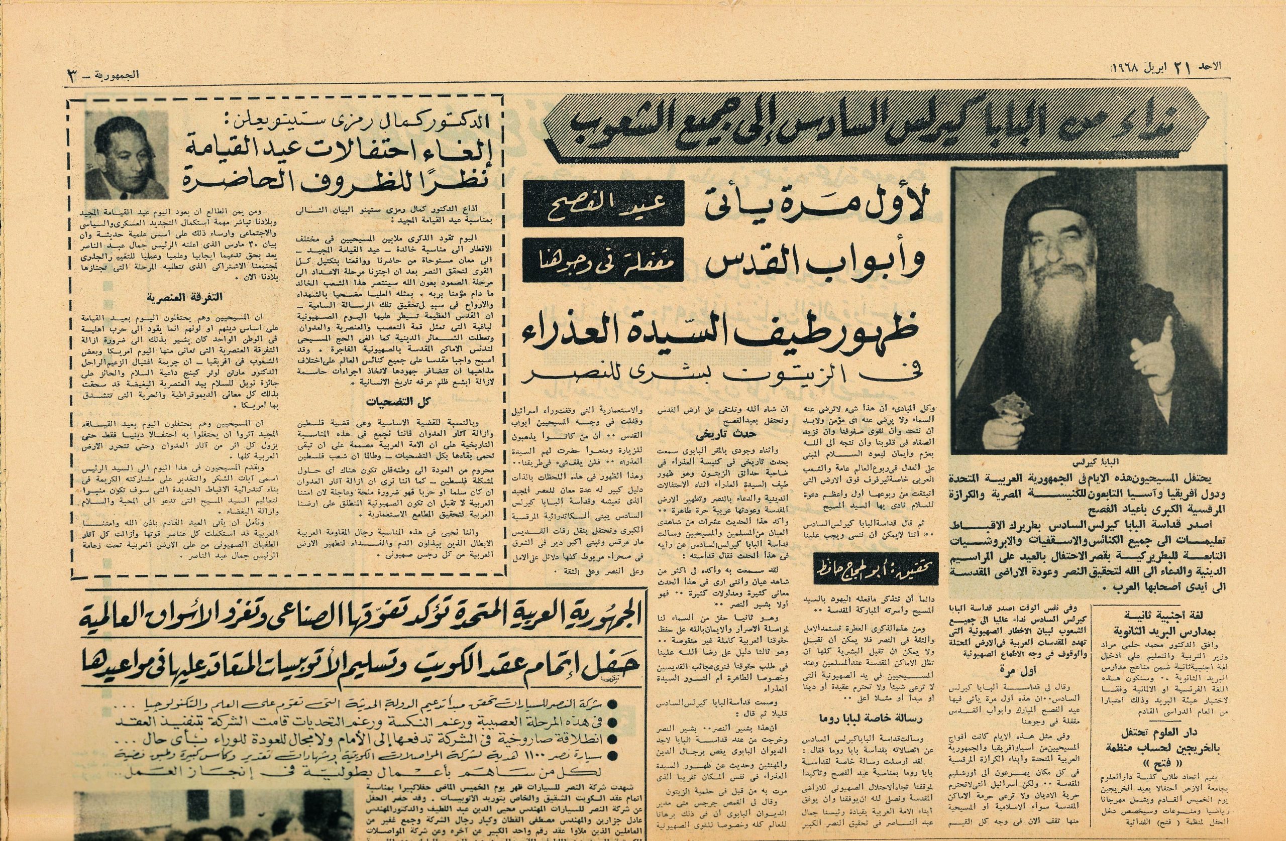 “وكان قداسة البابا المعظم الانبا كيرلس السادس قد زار الكنيسة فجر الخميس الثاني من أبريل الحالي ، حيث أدي الصلاة وتفقد المنشأت الجديدة فيها مُفتتحا احتفالات ذلك اليوم الخالد الذي يوافق ذكري الظهور لاول مرة في هذا المكان المقدس.